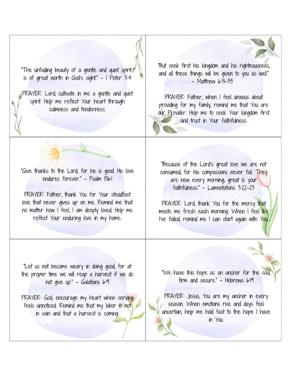 Find strength, peace, and encouragement in every season of motherhood with these 30 beautifully designed prayer cards. Each card features a heartfelt prayer and uplifting scripture to help you connect with God, refresh your spirit, and guide your heart through the joys and challenges of being a mom.