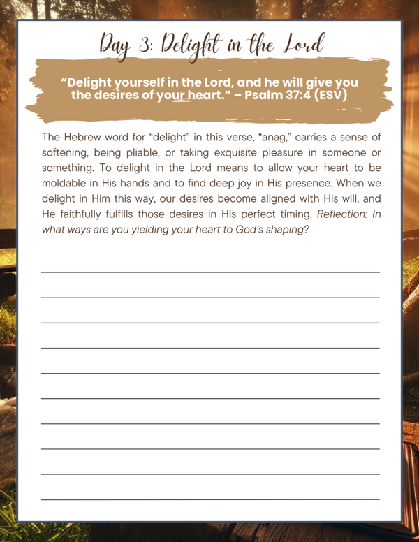 Each day features a Scripture passage, heartfelt reflection, and space for personal prayer and journaling. Through these guided moments, you’ll learn how to: