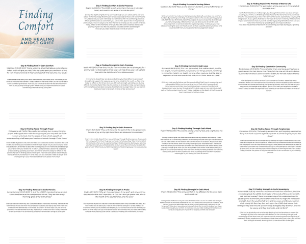Each day includes a short devotional, a comforting Bible verse, and journaling prompts to help you process emotions and draw nearer to God’s heart. You’ll find hope for tomorrow, strength for today, and peace that only His presence can bring.